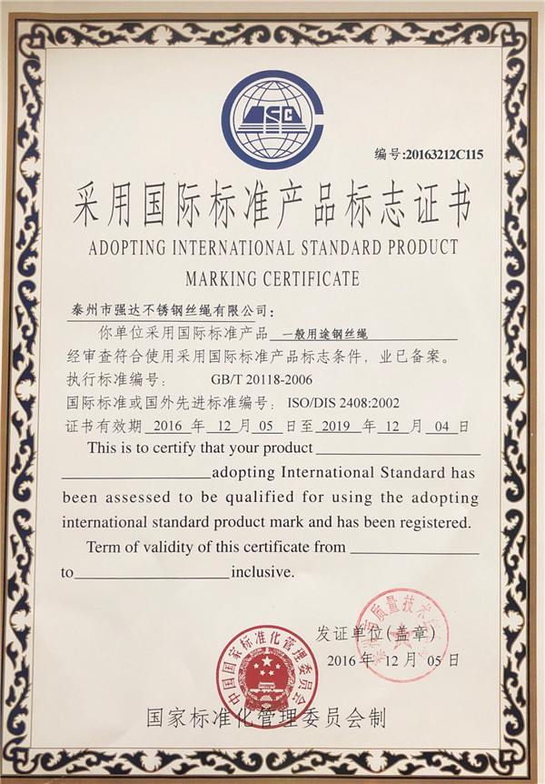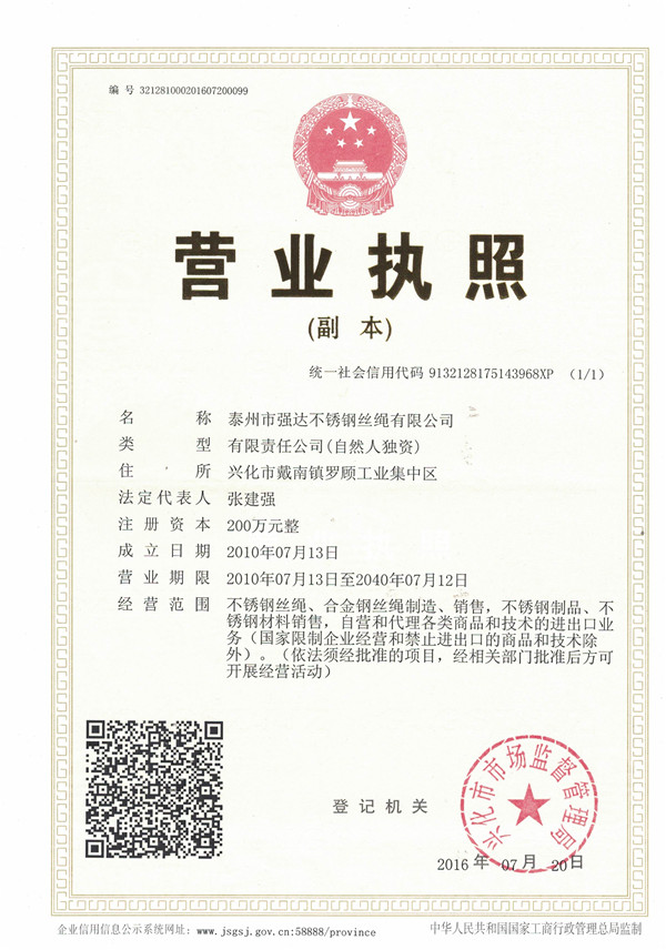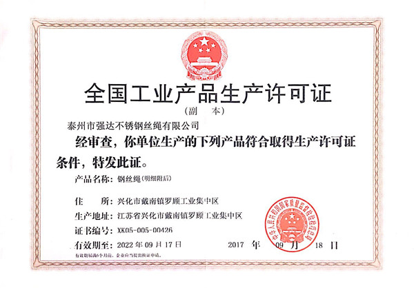泰州市強(qiáng)達(dá)不銹鋼絲繩有限公司位于江蘇興化市戴南經(jīng)濟(jì)開發(fā)區(qū),公司致力于不銹鋼絲繩產(chǎn)品生產(chǎn),立志成為“國內(nèi)技術(shù)標(biāo)桿型吊索具生產(chǎn)企業(yè)”。以此戰(zhàn)略思想指導(dǎo),公司堅決貫徹“質(zhì)量贏市場,管理增效益,誠信贏天下”的質(zhì)量方針。以完善的服務(wù)在國內(nèi)不銹鋼絲繩市場樹立良好的品牌形象。公司榮獲“江蘇省質(zhì)量信得過企業(yè)。     靈活的管理機(jī)制,經(jīng)驗(yàn)豐富的